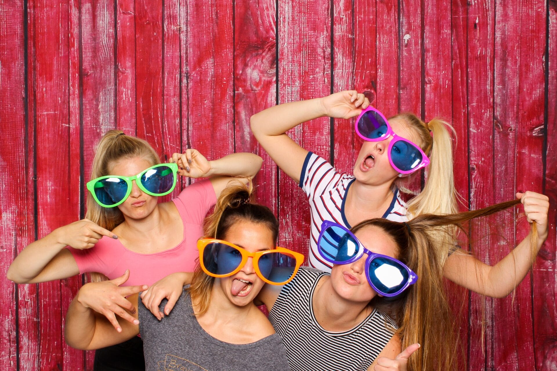 Mädchengruppe mit Brillen albern vor einer Fotobox - freche Mädchen mit Sonnenbrillen